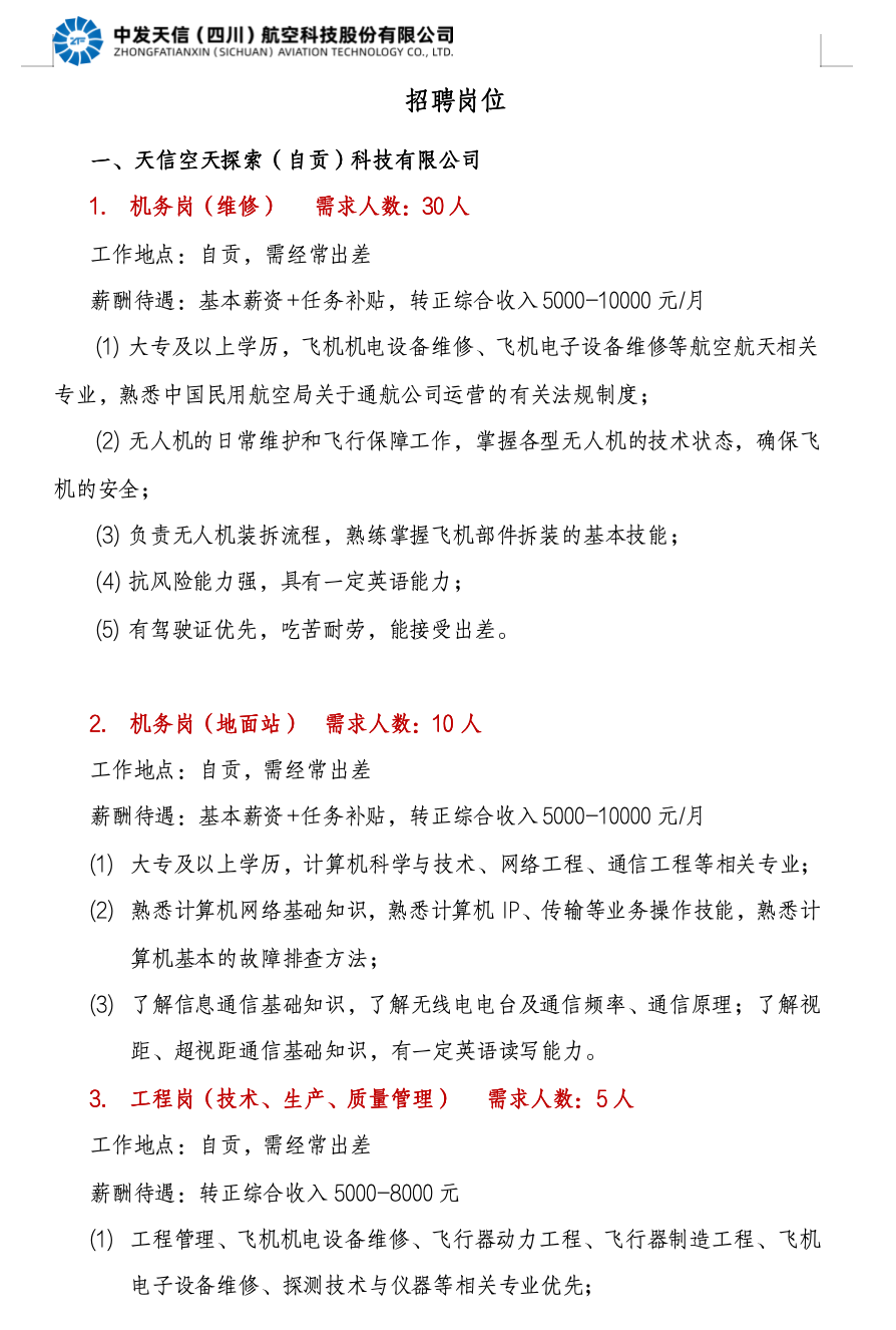 机务岗(维修)、机务岗(地面站)、工程岗(技术、生产、质量管理)