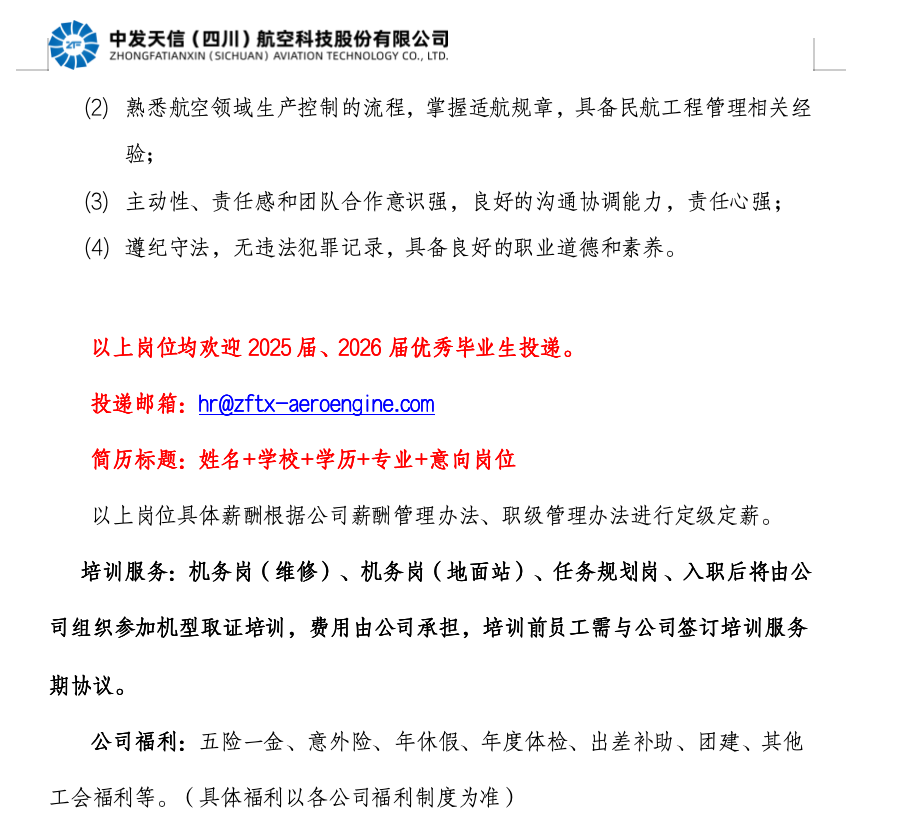 工程岗(技术、生产、质量管理):工程管理、飞机机电设备维修、飞行器动力工程、飞行器制造工程、飞机电子设备维修、探测技术与仪器等相关专业优先