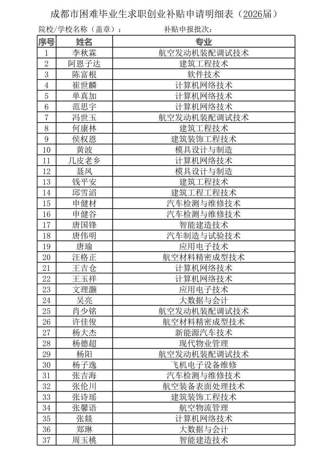 根据成都市人力资源和社会保障局、成都市财政局和成都市教育局相关文件精神,按照高校毕业生求职创业补贴发放实施方案,经各学院严格审核,招生就业处汇总,现将我校2026届毕业生申报学生名单进行公示。