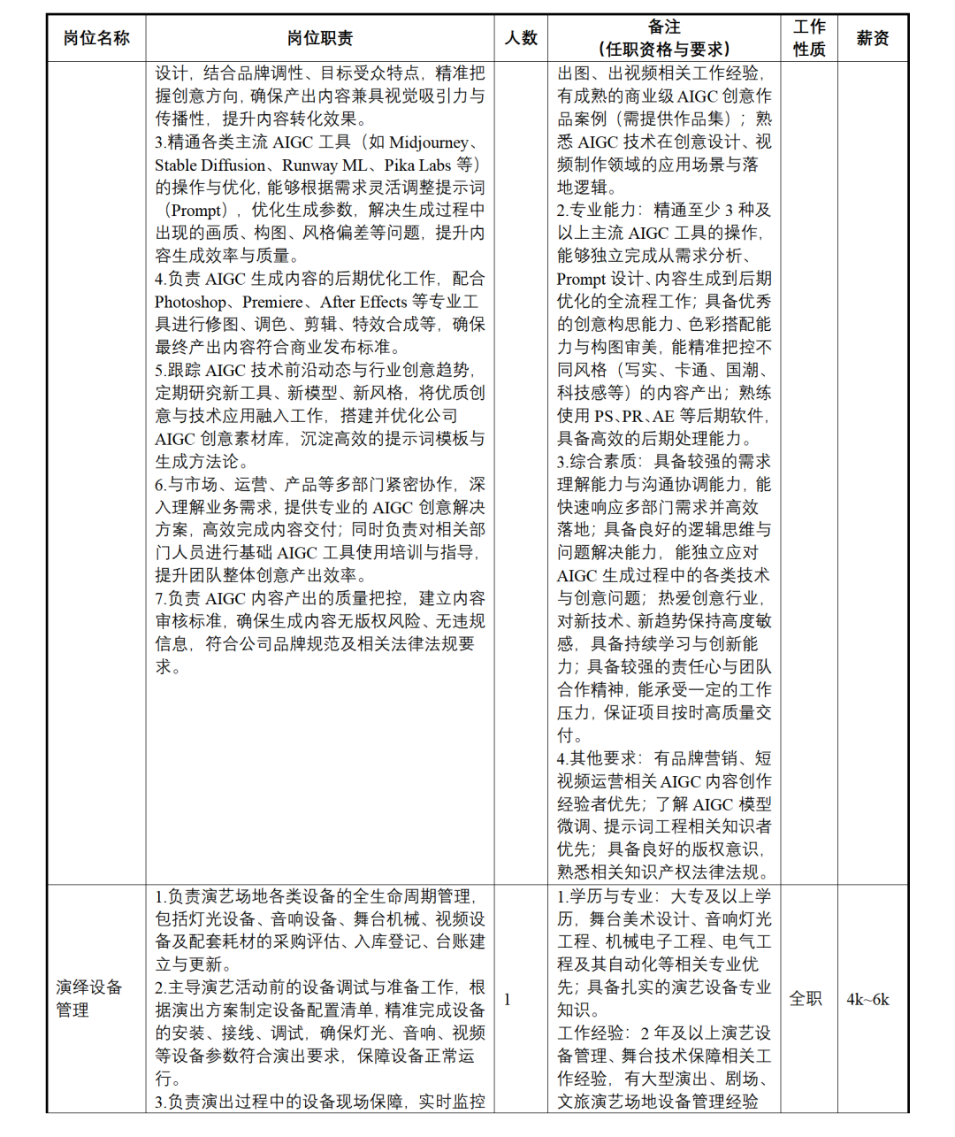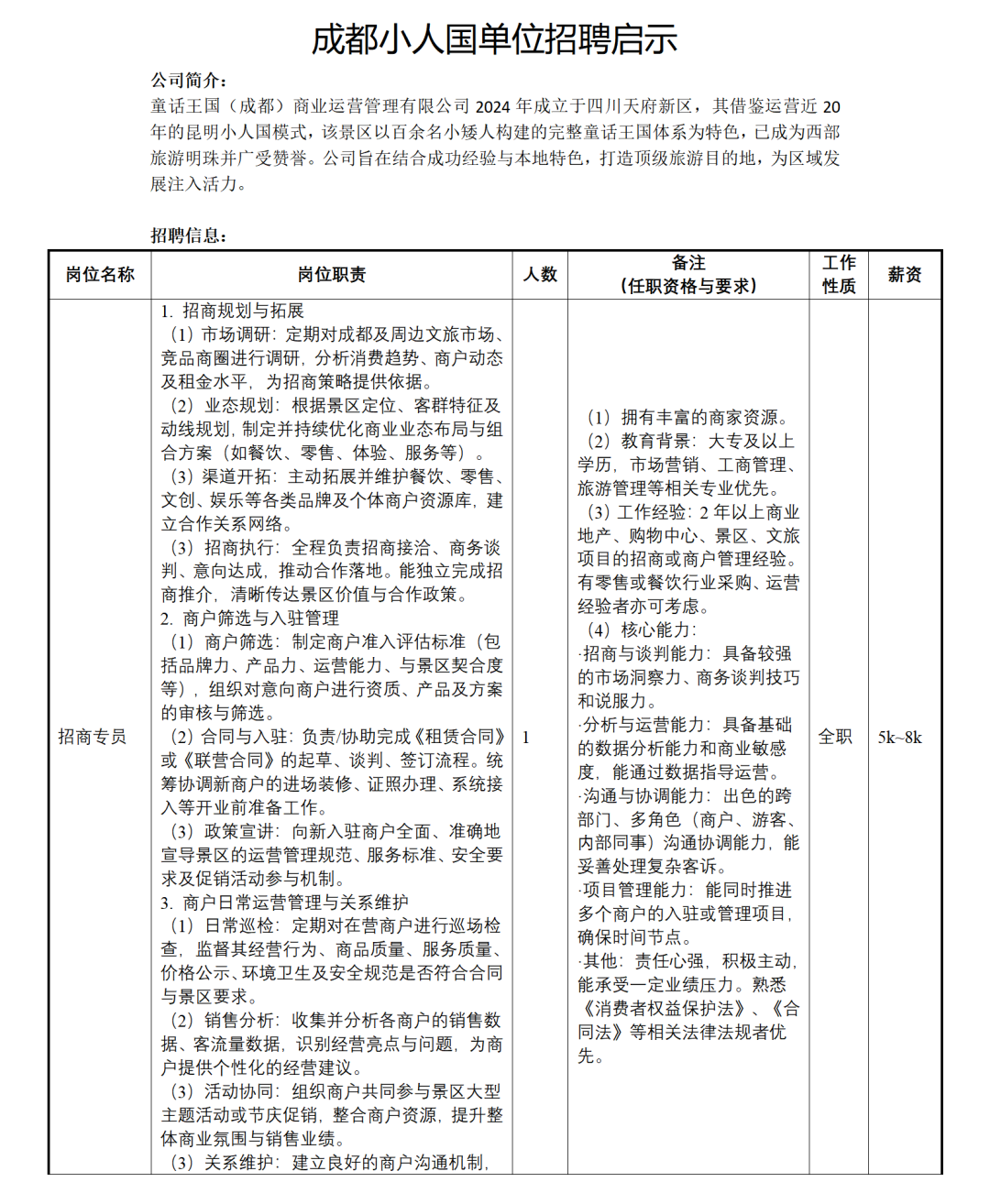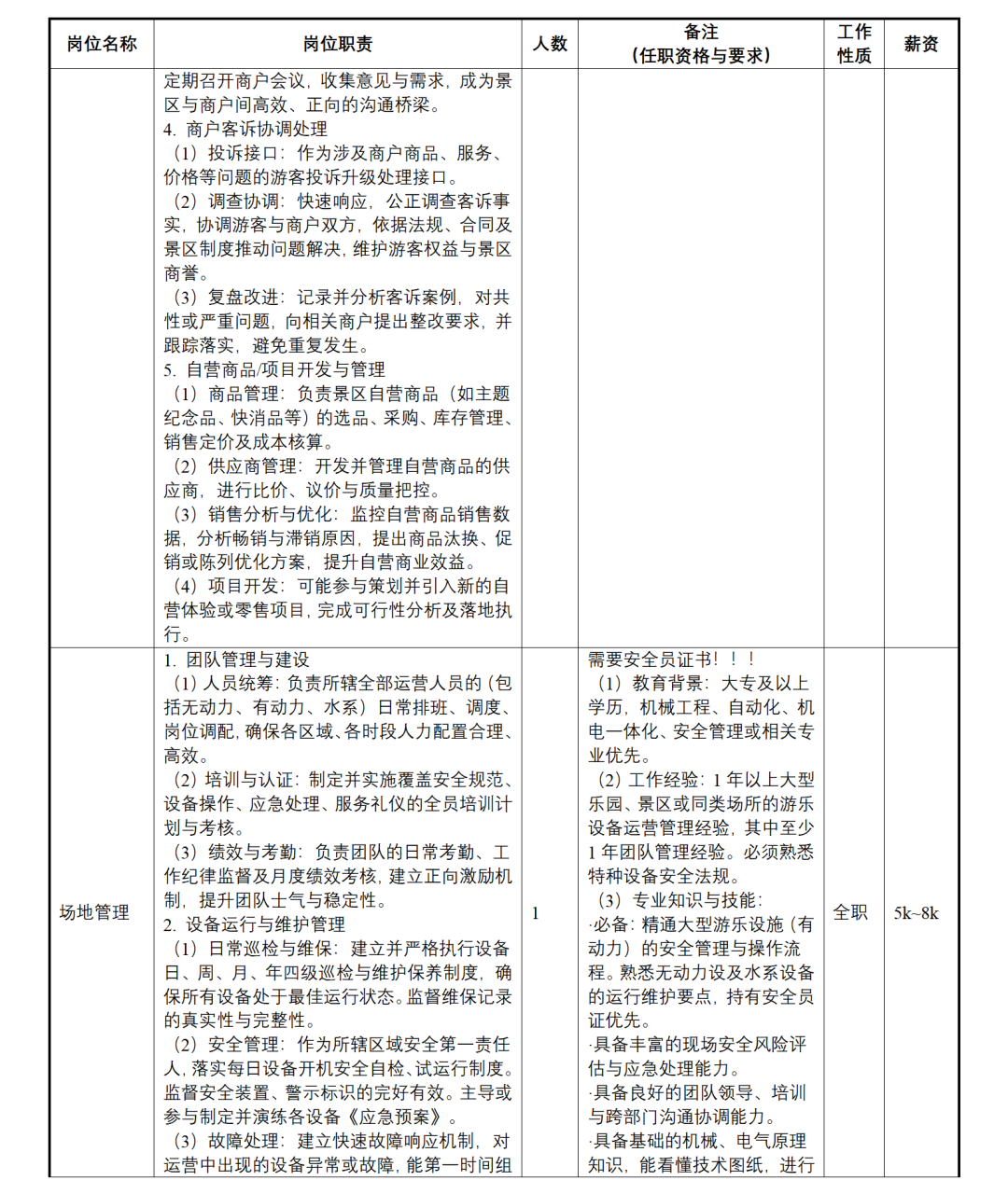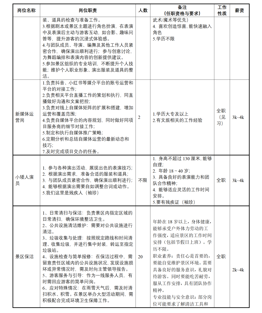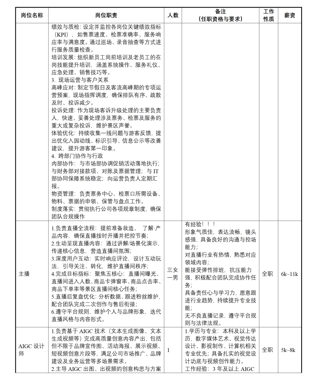 招商专员,场地管理,票务主管,主播,AIGC设计师,演绎设备管理,景区主要演员,景区NPC演员,新媒体运营岗,小矮人演员,仓库管理员,检票员,景区保洁