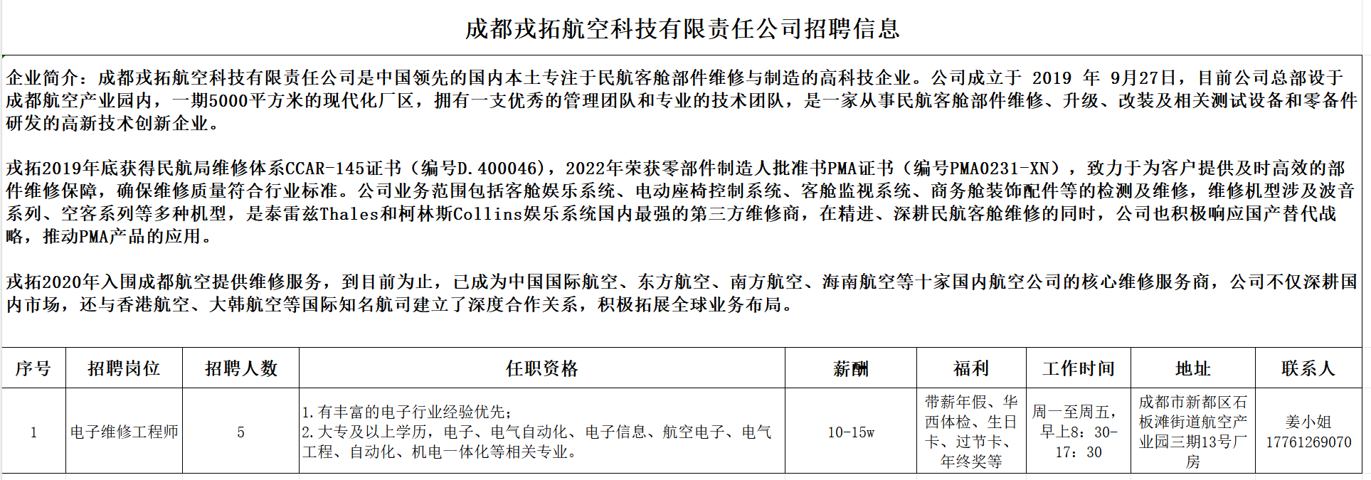 招聘岗位:电子维修工程师(详情见下)