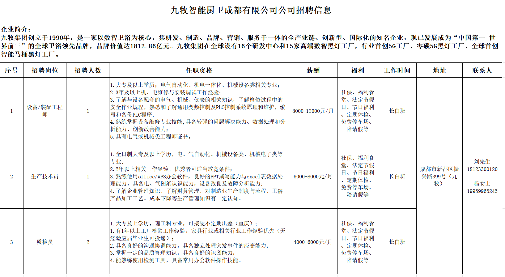 招聘岗位:设备/装配工程师,生产技术员,质检员(详情见下)