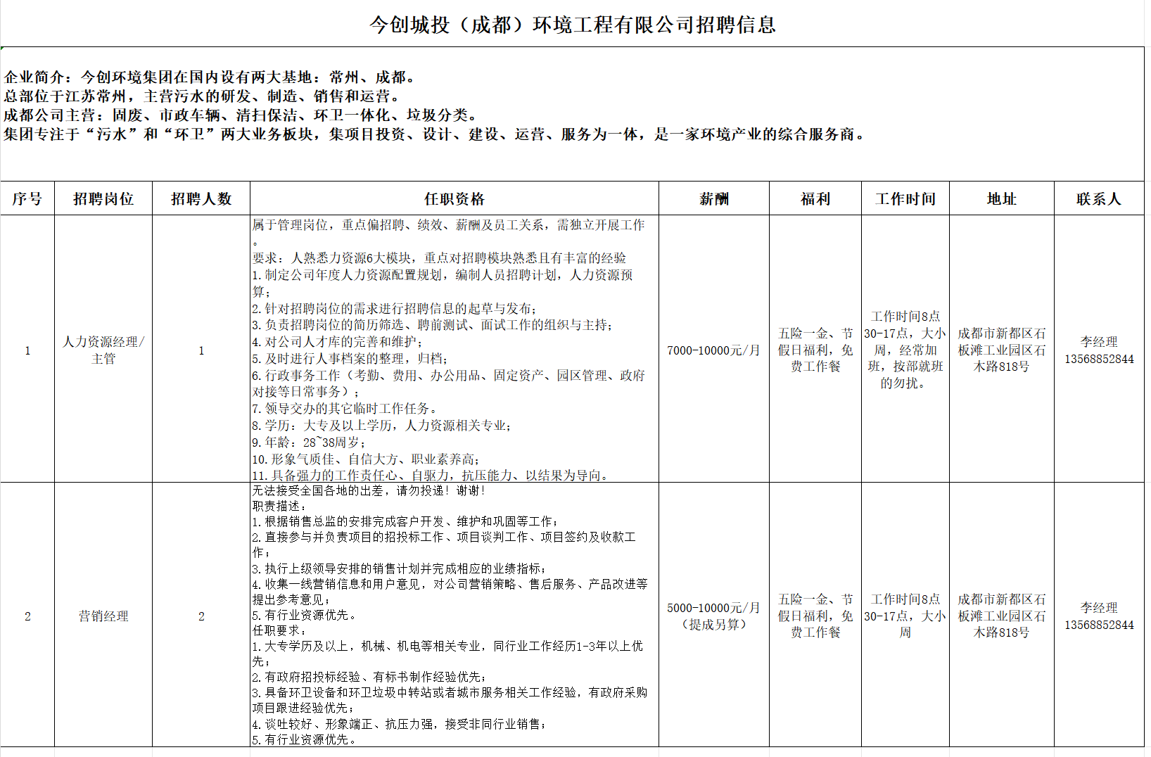 招聘岗位:人力资源经理/主管,营销经理(详情见下)