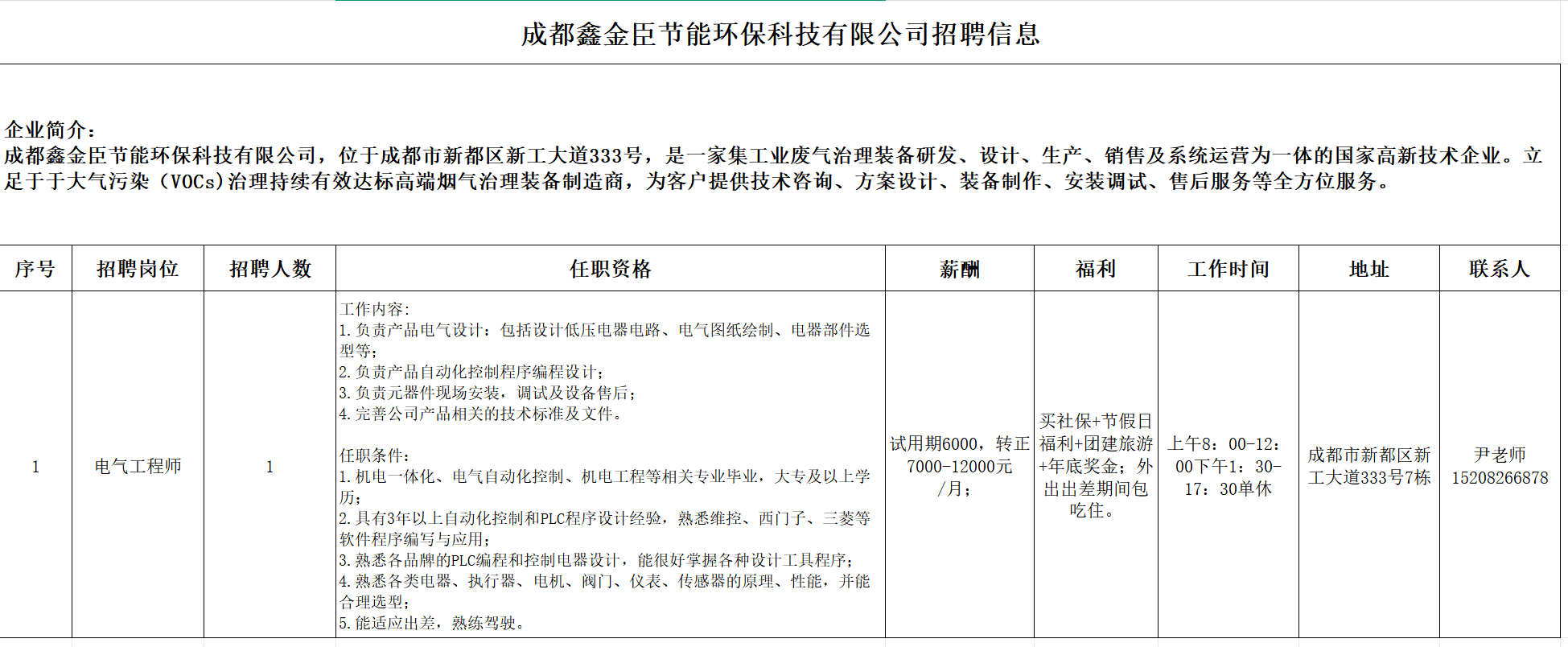 招聘岗位:电气工程师(详情见下)