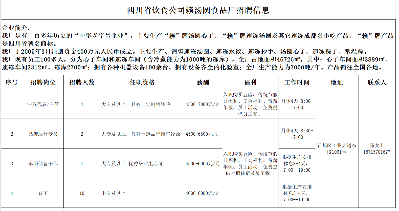 招聘岗位:业务代表/主管,品牌运营专员,车间储备干部,普工(详情见下)