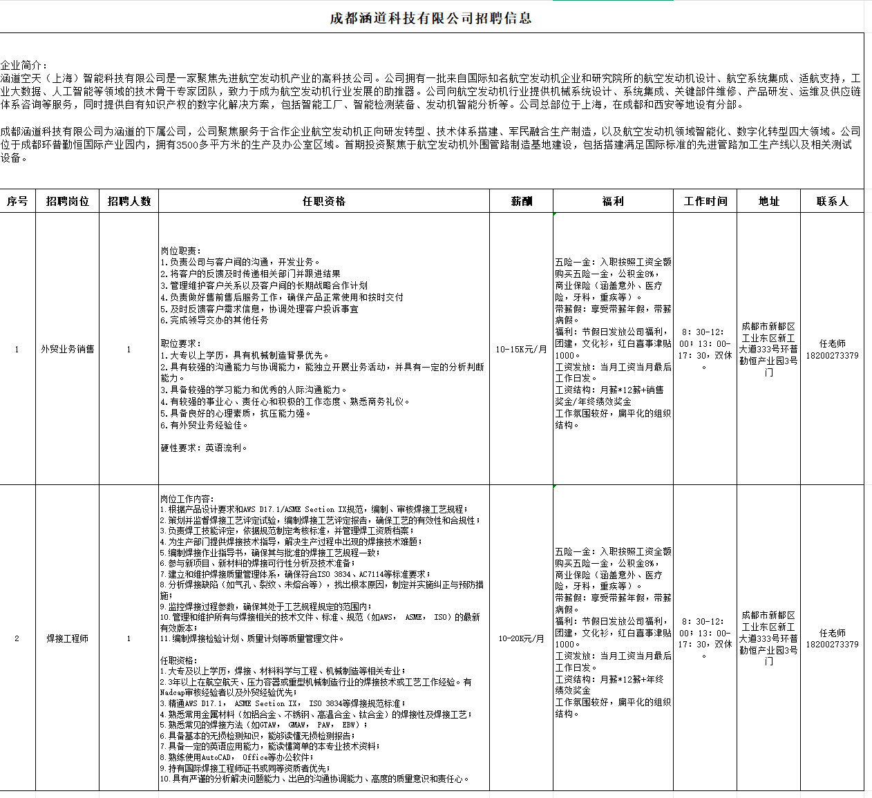 招聘岗位:外贸业务销售,焊接工程师